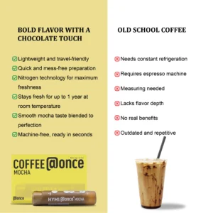 افتح الكبسولة، وامزجها مع 250 – 300 مل من الماء أو الحليب (ساخن أو بارد)، ثم اضغط من الأعلى. استمتع بكوب موكا جاهز في ثوانٍ.